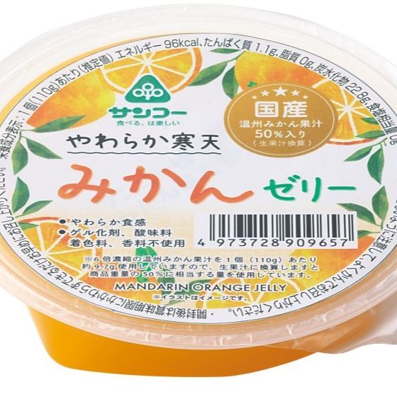 8大アレルゲン原料不使用。主要原料は国産由来。国産うんしゅうみかんの濃縮果汁を50%(生果汁換算)使用し、寒天でかためた、やわらか食感ゼリー。ゲル化剤、酸味料、着色料、香料不使用。