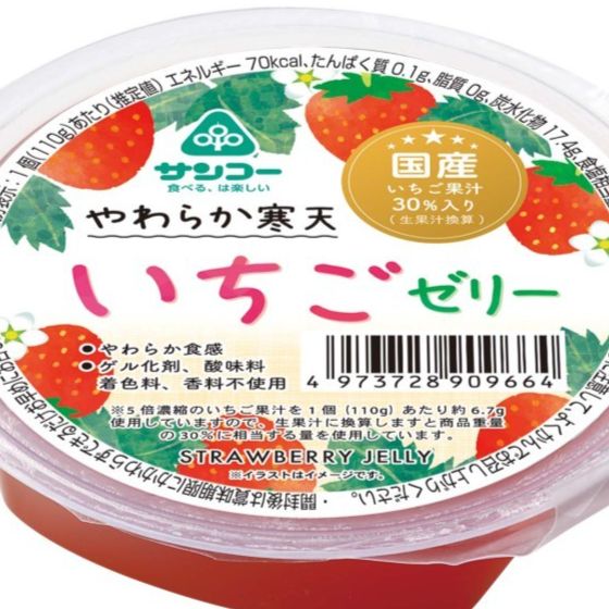 8大アレルゲン原料不使用。主要原料は国産由来。国産いちごの濃縮果汁を20%(生果汁換算)使用し、寒天でかためた、やわらか食感ゼリー。ゲル化剤、酸味料、着色料、香料不使用。
