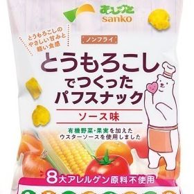「とうもろこしでつくったパフスナック 塩味」の姉妹品。国産の有機野菜・果実が主原料のソースで味付けしました。8大アレルゲン原料不使用です