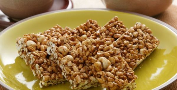 ポップさせたはとむぎと玄米を、黒糖風味の糖蜜で固めて、サクッとした歯応えのおこしにしました。