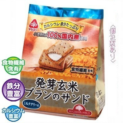 カルシウム・鉄分たっぷり!食物繊維豊富な小麦ふすま(ブラン)と粗挽き焙煎発芽玄米を練り込んだ香ばしいビスケットで、ミルク風味のクリームをサンドしました。