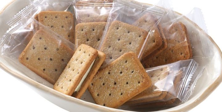 食物繊維豊富なブラン(小麦ふすま)と粗挽き焙煎発芽玄米を使ったサンドビスケットです。