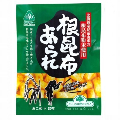 国産もち米の生地を香ばしく焼き上げ、北海道産根昆布由来の粉末を使用したタレで仕上げました。根昆布風味のあられです。
