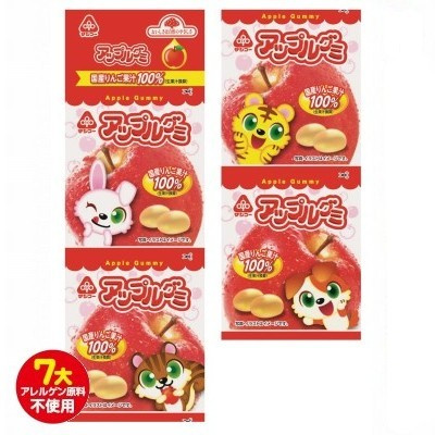 7大アレルゲン原料不使用。主要原料は国産由来。香料を使わず、国産りんごの濃縮果汁を100%(生果汁換算)使用したグミ。光沢剤は100%ヤシ由来です。便利な4連パック。