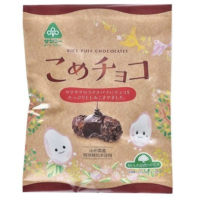 山形県産の特別栽培米から作ったパフにチョコをたっぷりしみこませた軽い食感のお菓子です。