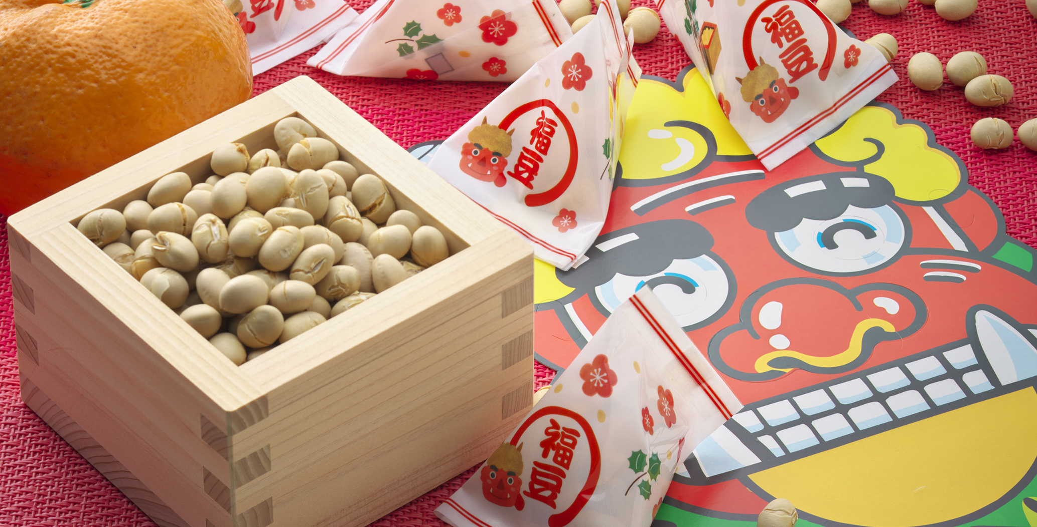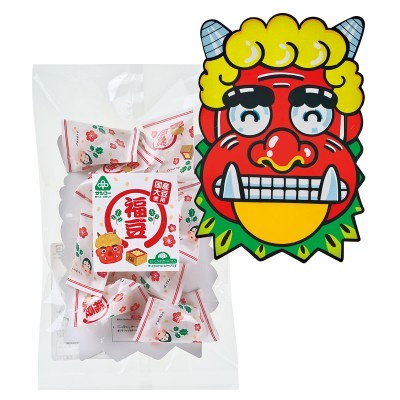 北海道産の大豆をサクサク香ばしく熱風焙煎し、小分けに便利なテトラタイプの小袋に入れました。鬼の面も入っています。