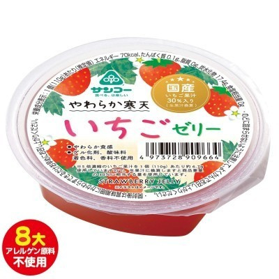 8大アレルゲン原料不使用。主要原料は国産由来。国産いちごの濃縮果汁を30%(生果汁換算)使用し、寒天でかためた、やわらか食感ゼリー。ゲル化剤、酸味料、着色料、香料不使用。