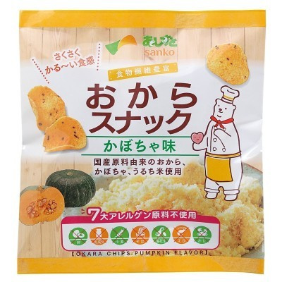 国産原料由来のおからを主原料に、国産かぼちゃと国産うるち米を加えて、さくさくカリッとした軽い食感にフライしました。ほんのりやさしいかぼちゃ味のスナックです。