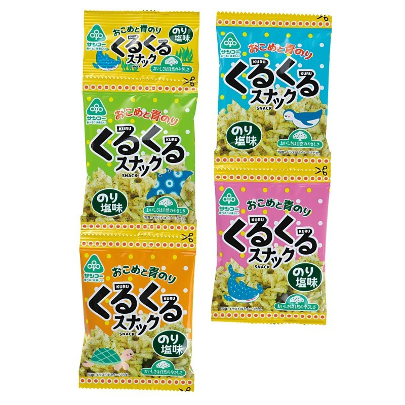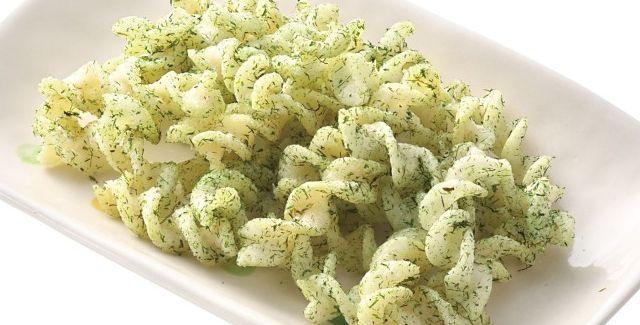 青のり風味を感じられる、8大アレルゲン原料不使用のスナックです。国産うるち米を米粉にしてから使用しました。くるくるの形状にしてフライをすることで、カリポリ食感に仕上がっています。